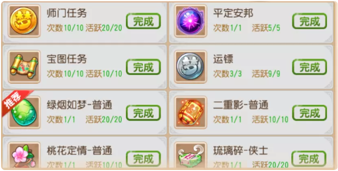 1.一条龙520:五个副本、捉鬼20只;侠士副本每天必刷,因为副本每天的50点侠义值,运气来了还有兽决彩果等,甚至高级兽决!