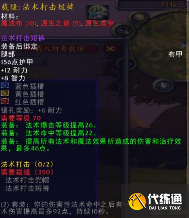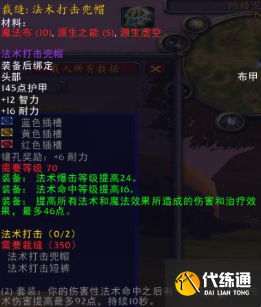 法术打击兜帽:破碎大厅掉落的法术打击兜帽图纸,和法师打击短裤图纸,制作出来的装备是一个套装组合,套装的一个特效还是非常强力的。能在10秒钟之内提升最高92点法伤伤害,即使不算上套装效果,法师打击兜帽的46点法伤24暴击16命中,已经比绝大部分的装备优秀了。