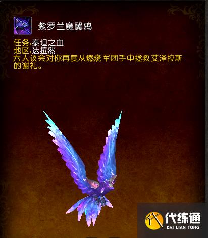 击杀7.3安托鲁斯,燃烧王座尾王阿古斯(英雄难度及以上)会获得任务物品,完成任务之后获得限时绝版坐骑紫罗兰魔翼鸦。