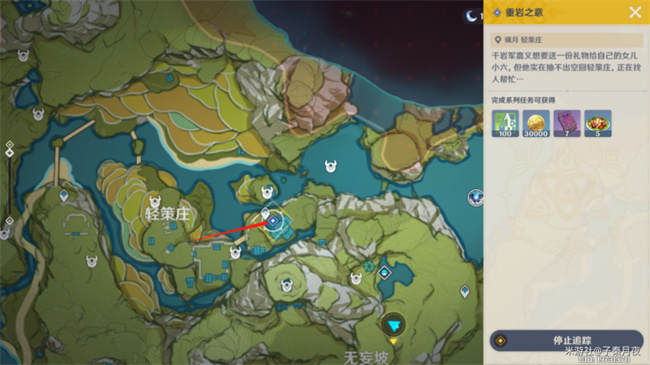 重岩之意任务简单,需要先回轻策庄找若心,然后在路上根据三处线索找到躲起来的小六。(千岩军嘉义想要送一份礼物给自己的女儿小六,但他实在抽不出空回轻策庄,正在找人帮忙)