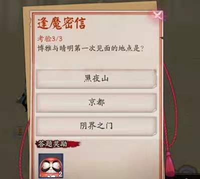 逢魔密信是玩家要进行的答题任务,其中的问题博雅与晴明第一次见面的地点是在黑夜山。