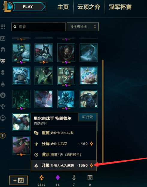 2,选择一个合适的皮肤碎片,右键鼠标点击,升级为永久皮肤,在弹出的窗口中点击升级即可。